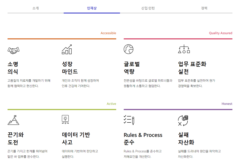 핵심가치: 환자 중심, 혁신, 품질, 윤리 (환자들의 더 나은 삶을 위한 책임감과 끊임없는 도전 강조)