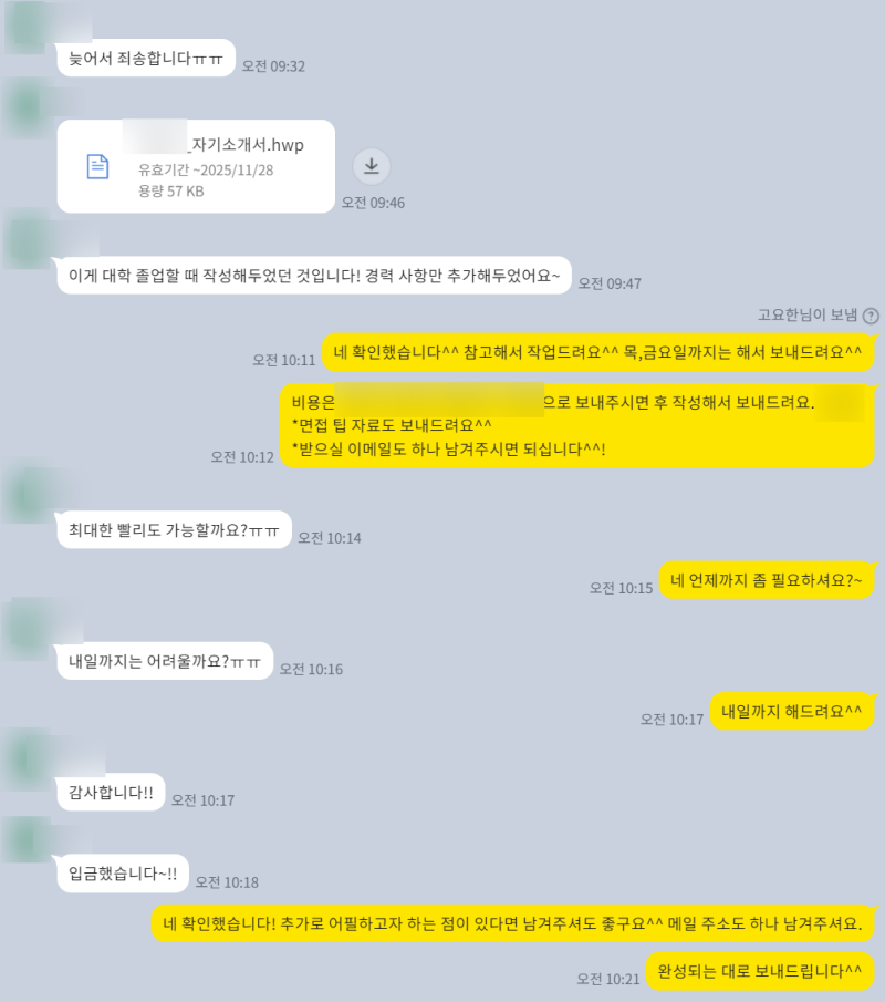 - 자기소개서 대필: 지원자의 인터뷰 내용을 바탕으로 자기소개서 작성