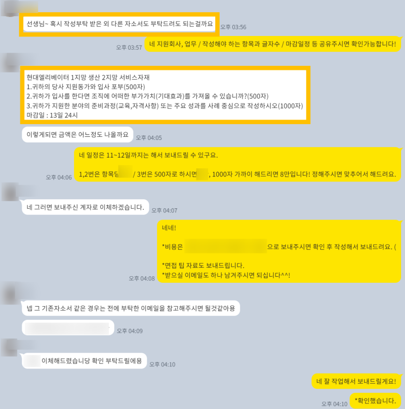 수백명 이상 합격 사레 보유 – 대기업/공기업/공무원 및 병의원 / 자소서, 경력기술서, 직무수행계획서 첨삭대필 작업드리고 있습니다.  (현대자동차, 기아자동차, 삼성전자, SK하이닉스, 포스코, 현대로템, 중공업, 건강보험공단, 한국전력, 한국도로공사, 각종 병원, 공무원 등 매년 합격 보유)